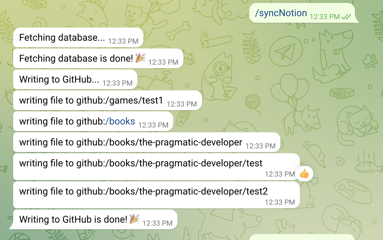 The second thing is getting pages from notion. So the idea is creating a database on notion that contains multiple nested pages with their slugs/paths and this command will get the database by its id and fetching all pages under this databases including nested databases, then create commits with the files on Notes Repo on GitHub. That’s the idea I’ve came with.